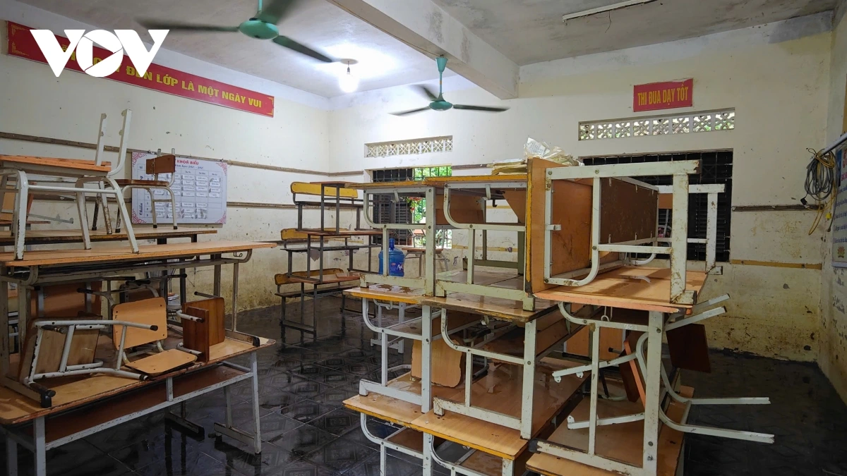 Sau bão số 10, lũ bất ngờ tràn về điểm trường Hang Đá, thuộc Trường Tiểu học và THCS Tân Lang, xã Mường Cơi, tỉnh Sơn La vào sáng sớm 29/9 khiến bàn ghế, sách vở bị chìm trong biển nước. Có thời điểm mực nước dâng cao hơn 1m, buộc nhà trường phải cho toàn bộ học sinh nghỉ học. Ngay khi nước rút, phụ huynh cùng thầy cô nhà trường đã nhanh chóng dọn dẹp trường lớp, sớm đưa việc học tập trở lại bình thường.