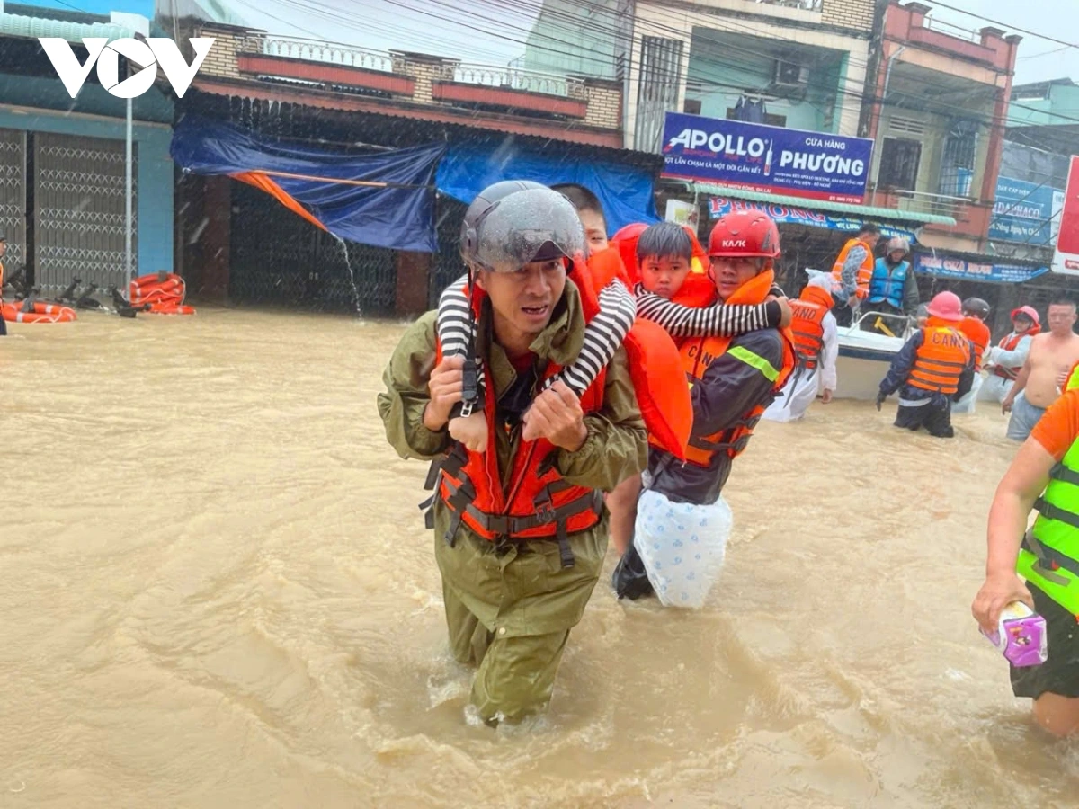 Ông Lê Huy Toàn, phường Quy Nhơn Bắc vui mừng cho biết: "Gia đình tôi có 5 người; tôi, vợ và con nhỏ nên phải đi lên trên đường lớn. Khi gặp được lực lượng tới cứu thì tôi rất mừng".