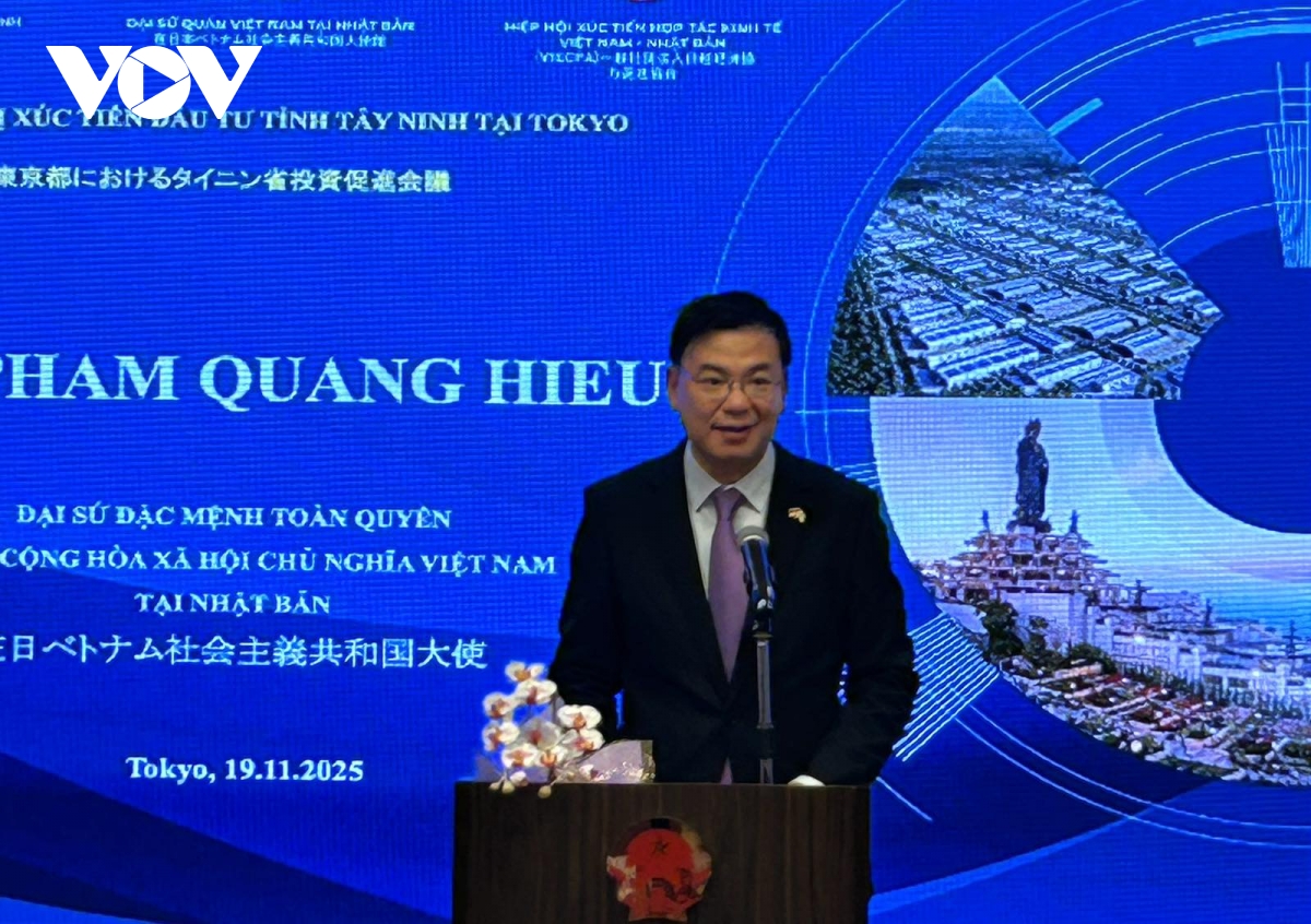 VOV.VN - Hôm nay 19/11, tại Tokyo, Uỷ ban nhân dân (UBND) tỉnh Tây Ninh phối hợp với Đại sứ quán Việt Nam tại Nhật Bản và Hiệp hội Xúc tiến hợp tác kinh tế Việt Nam - Nhật Bản tổ chức “Hội nghị Xúc tiến đầu tư tỉnh Tây Ninh tại Tokyo”, nhằm mở rộng hợp tác và thu hút đầu tư từ các đối tác Nhật Bản.