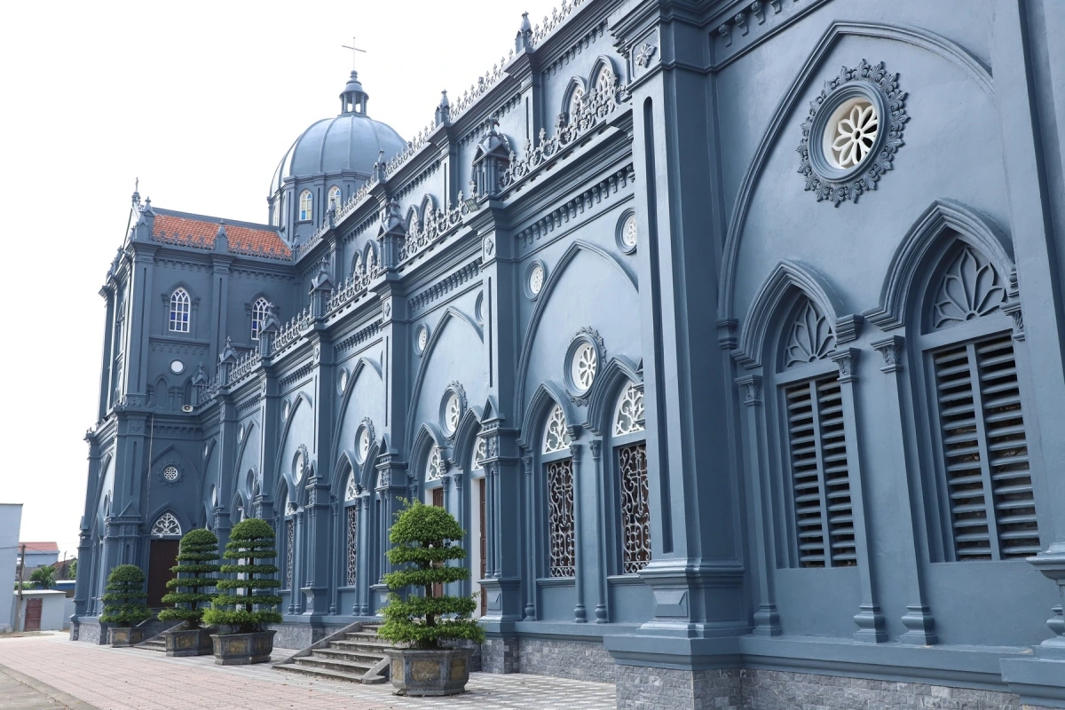 Hông nhà thờ phía Bắc, nơi các họa tiết hoa văn và phù điêu trang trí tinh xảo đắp nổi trên tường, tạo điểm nhấn kiến trúc độc đáo.