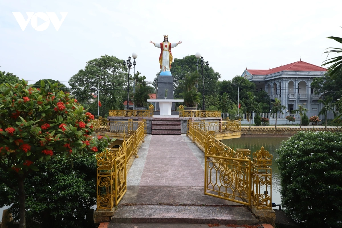 Khuôn viên lễ ngoài trời không gian rộng rãi, thoáng đãng, được bố trí hài hòa với cây xanh, hồ nước và lối đi, nơi giáo dân tụ họp trong các dịp lễ lớn.