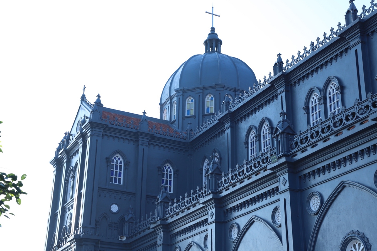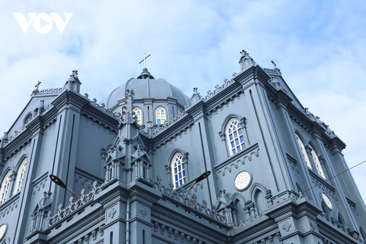 Mặt tiền thánh đường - các chi tiết kiến trúc châu Âu tinh xảo nổi bật, hài hòa với không gian rộng rãi và thoáng đãng của giáo họ.