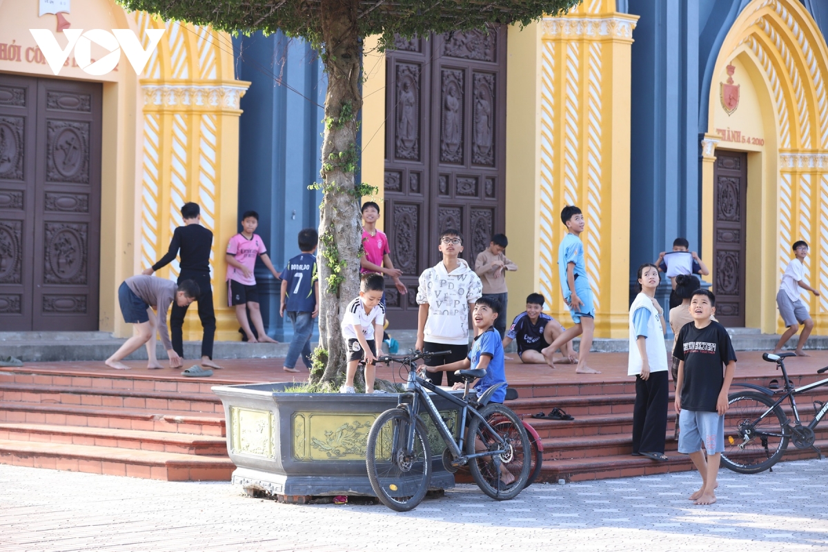 Sân đền rộng rãi trở thành nơi vui chơi rộn rã của trẻ em, mang hơi thở đời sống thường nhật bên thánh đường Hồng Quang.