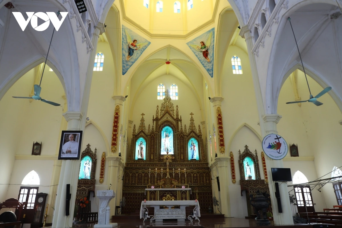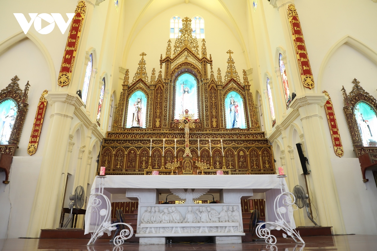 Gian chính điện thờ Gia đình Chúa - trái tim linh thiêng của nhà thờ Hồng Quang, nơi bàn thờ được trang trí tinh xảo, với kiến trúc mái vòm kết hợp các ô cửa kính màu.