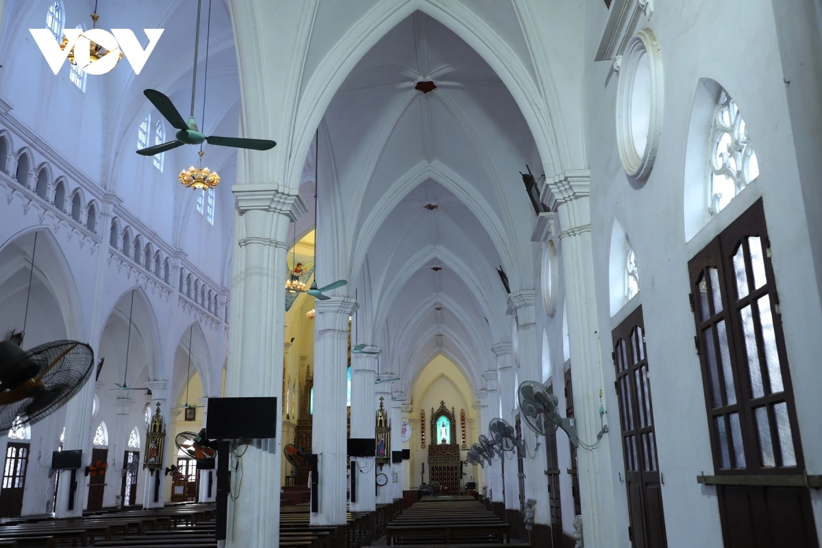 Hông nhà thờ phía Nam, các ô cửa sổ vòm và hoa văn chạm khắc tinh tế, vừa lấy sáng tự nhiên, vừa tô điểm nét cổ điển cho tổng thể công trình.