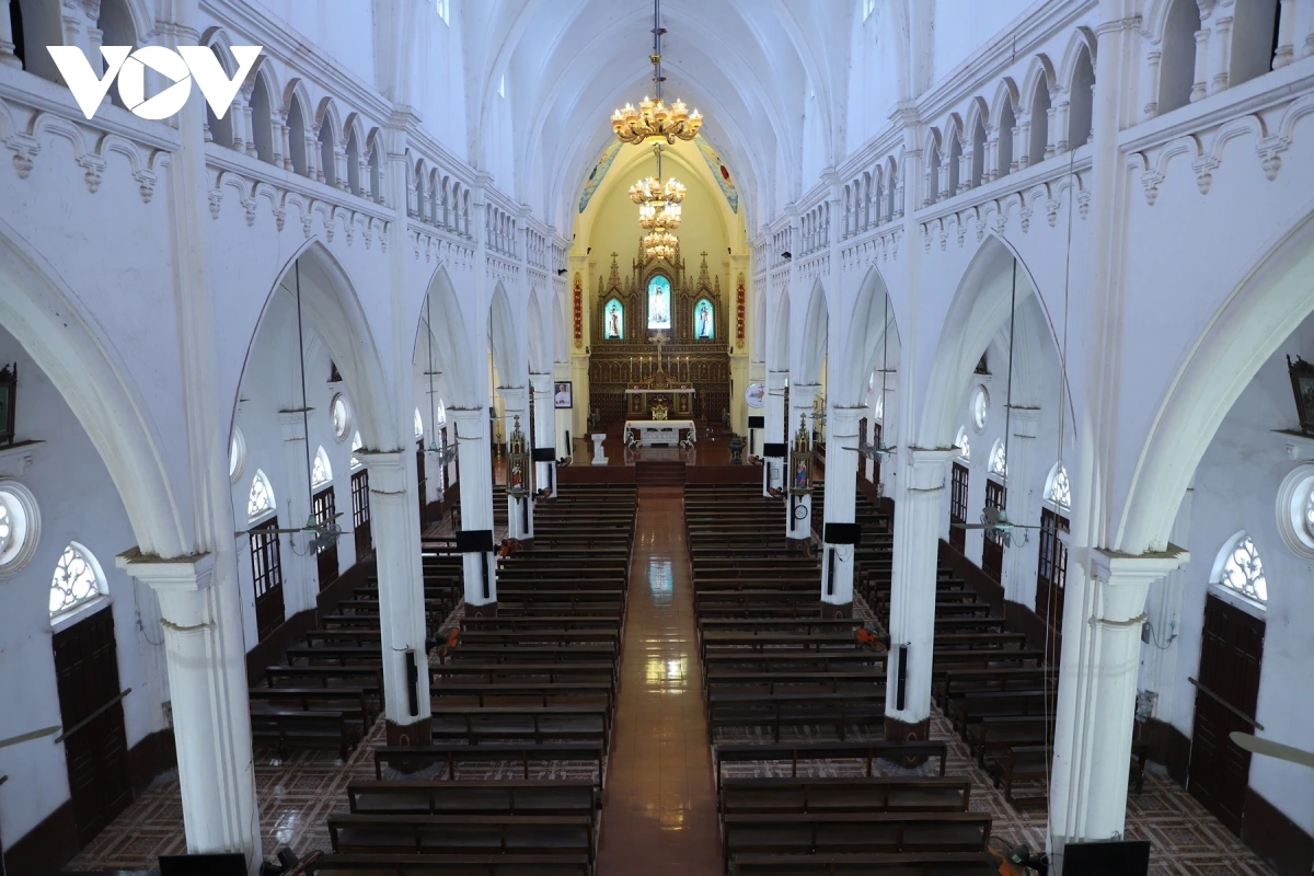 Không gian nội thất thánh đường – với kiến trúc mái vòm uyển chuyển kết hợp hoa văn từ các cột, tạo vẻ đẹp mềm mại, thanh thoát, mang đến cảm giác linh thiêng và huyền ảo cho ngôi thánh đường.
