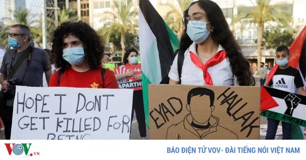 VOVVN - VOV.VN - Người biểu tình hô vang “Cảnh sát bạo lực cần bị tống giam” và giơ cao ảnh một nam giới bị cảnh sát Israel bắn chết hôm 30/5.