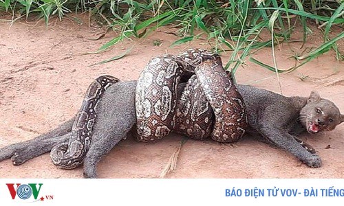 VOVVN - VOV.VN - Dù giãy giụa đến kệt sức nhưng mèo rừng vẫn không thể thoát được con trăn khổng lồ. May mắn nó đã được 2 người đi đường giải cứu.