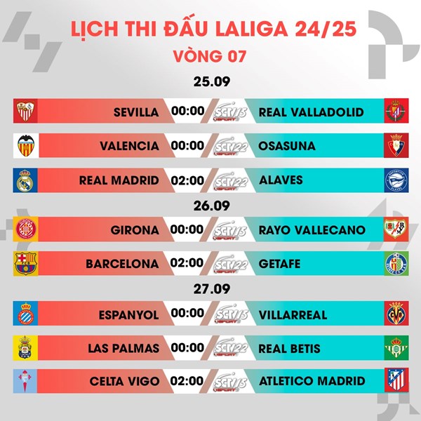 VOVVN - VOV.VN - Lịch thi đấu và trực tiếp vòng 7 La Liga 2024/2025, Atletico Madrid đại chiến với nhà đương kim vô địch Real Madrid trên sân nhà.