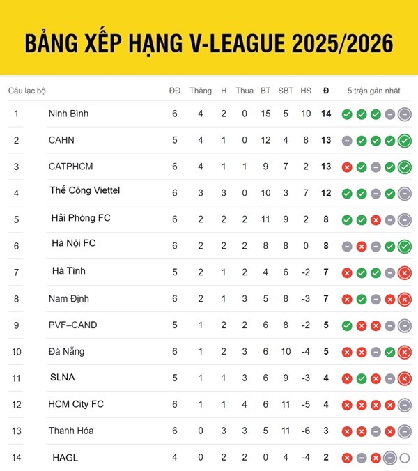 VOVVN - VOV.VN - Bảng xếp hạng V-League mới nhất, tốp đầu có sự cạnh tranh quyết liệt giữa 4 đội Ninh Bình, CLB CAHN, CLB CA TP.HCM và Thể Công Viettel. Trong khi đó, HAGL lại...