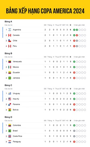 Bảng xếp hạng Copa America 2024 mới nhất: Xác định đội đầu tiên vào tứ kết