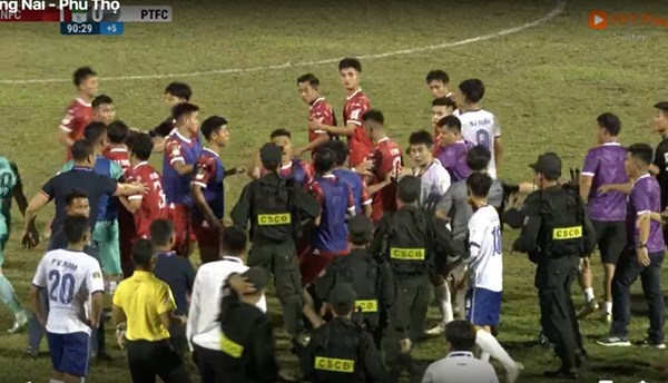 VOVVN - VOV.VN - Trọng tài Ngô Đắc Tiến rút ra 3 thẻ đỏ sau màn ẩu đả của cầu thủ CLB Đồng Nai và Phú Thọ tại giải hạng Nhất. Cảnh sát cơ động phải can...