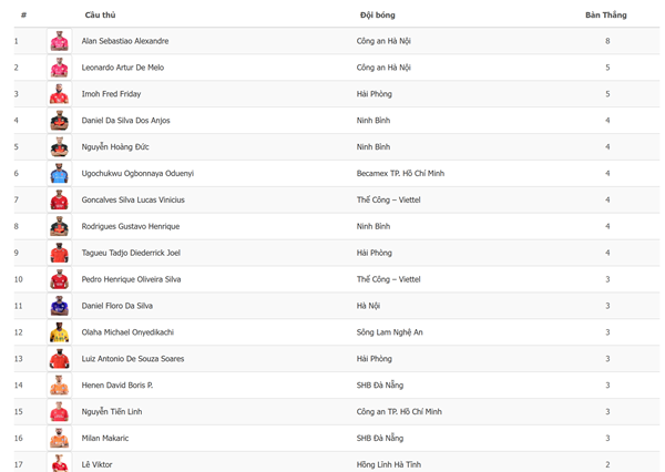 VOVVN - VOV.VN - Cập nhật bảng xếp hạng “Vua phá lưới” V-League 2025/2026 mới nhất sau vòng đấu thứ 9, Alan của CAHN vẫn dẫn đầu với 8 bàn thắng.