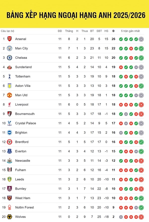 VOVVN - VOV.VN - Bảng xếp hạng Ngoại hạng Anh mới nhất: MU ở vị trí thứ 7 trong khi Man City đã rút ngắn khoảng cách trong cuộc đua vô địch với Arsenal.