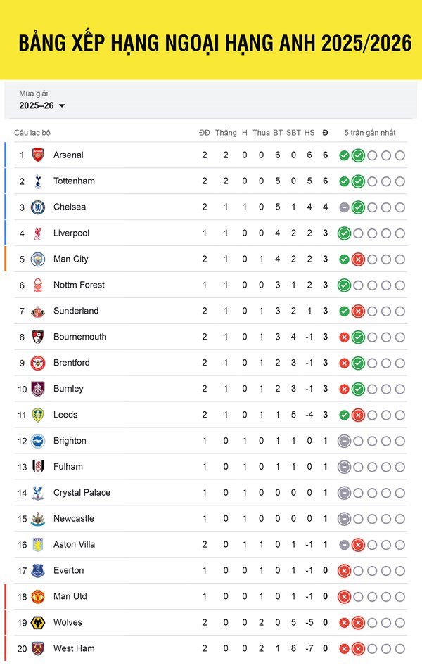 VOVVN - VOV.VN - Arsenal đã có chiến thắng đậm 5-0 trước Leeds Utd ở vòng 2 Ngoại hạng Anh 2025/2026, qua đó vươn lên dẫn đầu bảng xếp hạng.