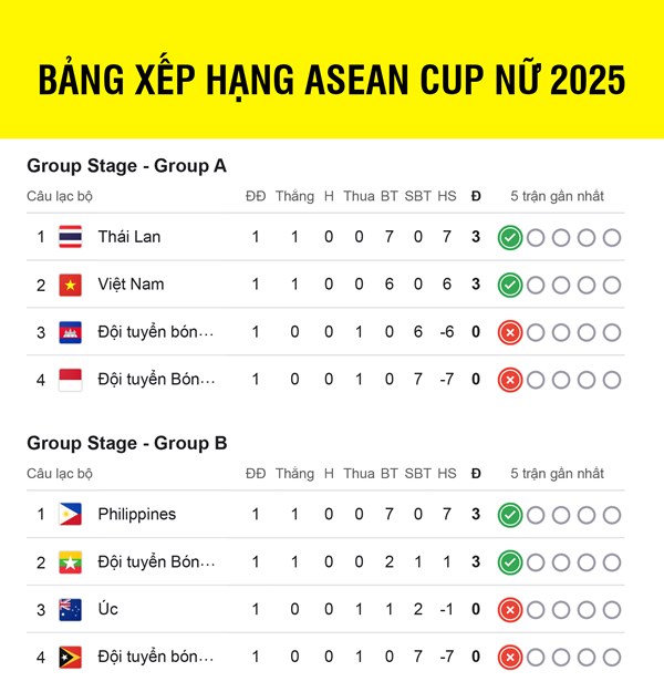 VOVVN - VOV.VN - Cập nhật bảng xếp hạng ASEAN Cup nữ 2025 sau lượt trận đầu tiên, cú sốc lớn nhất là ĐT nữ Australia thua ĐT nữ Myanmar với tỉ số 1-2, qua đó tạm...
