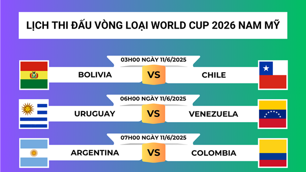 VOVVN - VOV.VN - Lịch thi đấu vòng loại World Cup 2026 khu vực Nam Mỹ lượt 16, Argentina chạm trán Colombia, trong khi Brazil đối đầu với Paraguay.