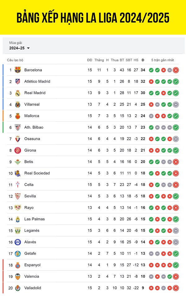 VOVVN - VOV.VN - Bảng xếp hạng La Liga 2024/2025 mới nhất, cuộc đua vô địch đang diễn ra hấp dẫn giữa Barca, Atletico Madrid và Real Madrid.
