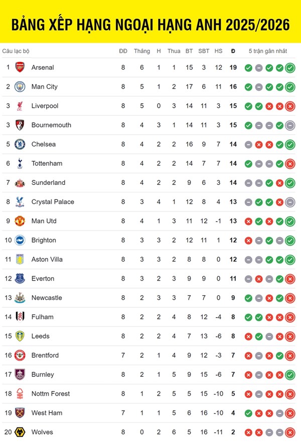 VOVVN - VOV.VN - Bảng xếp hạng Ngoại hạng Anh mới nhất, MU thăng tiến lên vị trí thứ 9, Liverpool tụt hạng sâu, mất vị trí nhì bảng vào tay Man City..