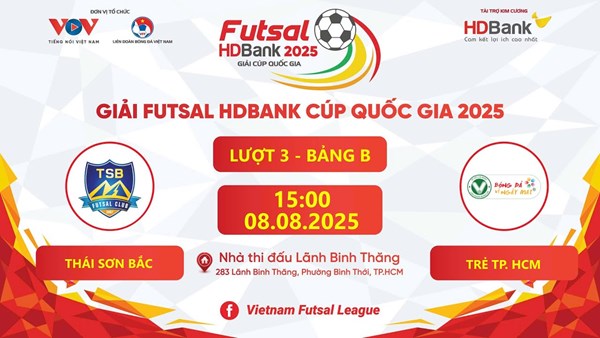 VOVVN - VOV.VN - Trực tiếp Thái Sơn Bắc - Trẻ TP.HCM trong khuôn khổ giải Futsal HDBank Cúp Quốc gia 2025 diễn ra vào lúc 15h ngày 8/8.