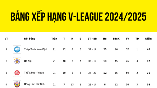 VOVVN - VOV.VN - Cập nhật bảng xếp hạng V-League 2024/2025 mới nhất, CLB CAHN sau chiến thắng 3-0 trước Quảng Nam ở vòng 21 đã đẩy Thanh Hóa xuống vị trí thứ 6 để leo lên...