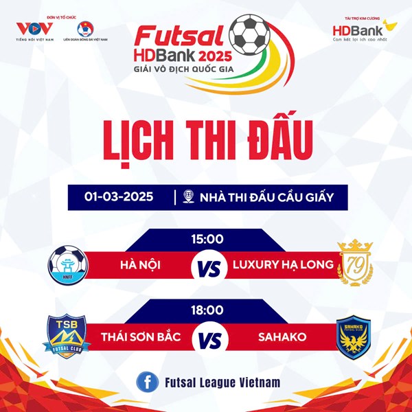 VOVVN - VOV.VN - Lịch thi đấu vòng 3 Giải Futsal HDBank VĐQG 2025, các trận đấu diễn ra trong 2 ngày 1 và 2/3/2025.