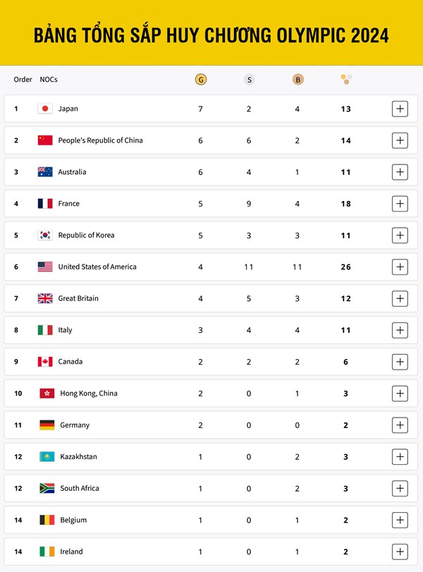 VOVVN - VOV.VN - Cập nhật bảng tổng sắp huy chương Olympic 2024 mới nhất tính đến 8h ngày 31/7, Đoàn Thể thao Nhật Bản vẫn dẫn đầu, trong khi đó Đoàn Thể thao Việt Nam vẫn...