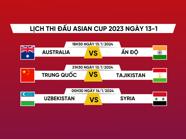 VOVVN - VOV.VN - Lịch thi đấu và trực tiếp Asian Cup 2023 hôm nay 13/1 với 3 cuộc đọ sức ĐT Australia – ĐT Ấn Độ, ĐT Trung Quốc – ĐT Tajikistan và ĐT Uzbekistan –...