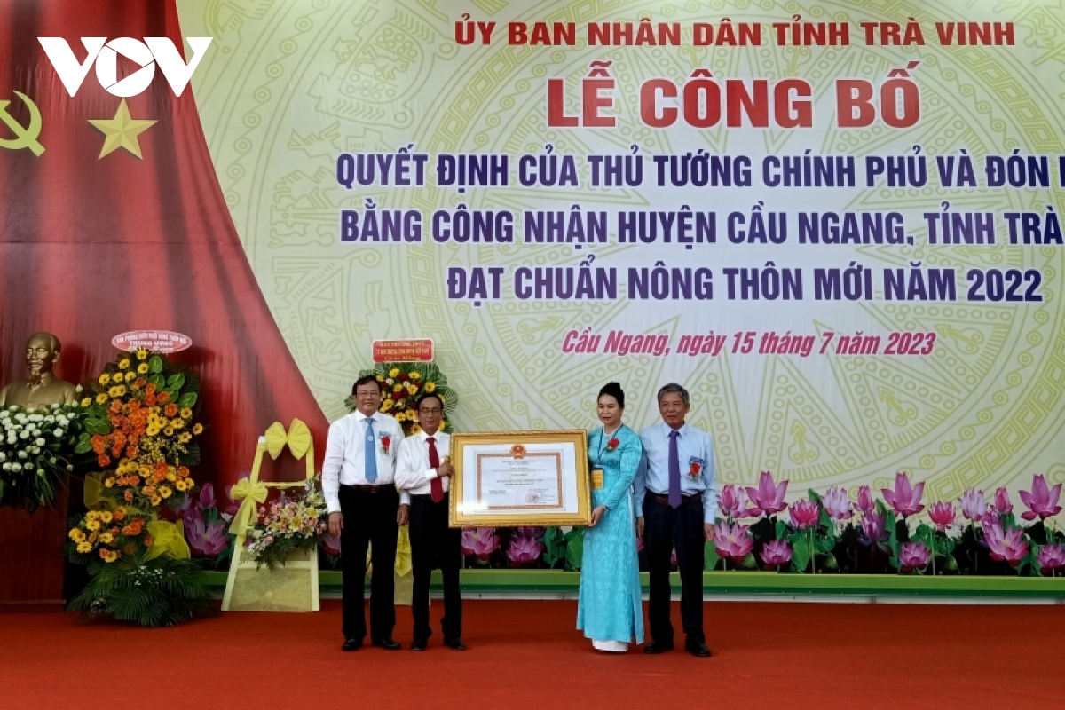 VOV.VN - Ngày 15/7, UBND tỉnh Trà Vinh tổ chức lễ công bố quyết định của Thủ tướng Chính phủ và đón Bằng công nhận huyện Cầu Ngang và huyện Duyên Hải đạt chuẩn nông thôn mới.