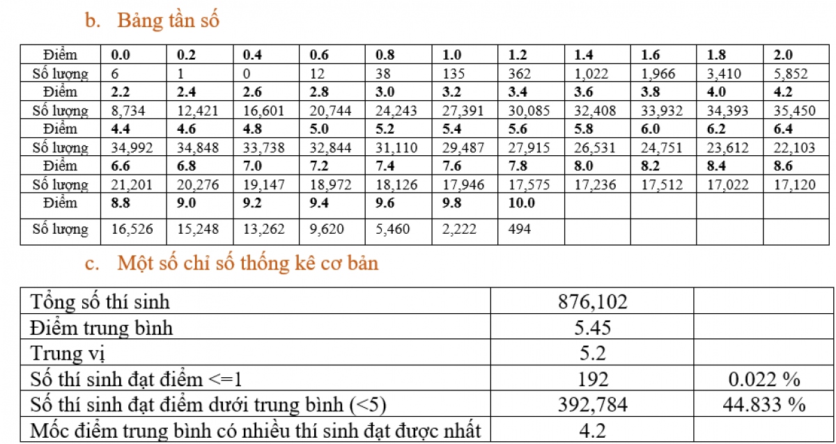 Theo Bộ GD-ĐT, kết quả phân tích phổ điểm thi tốt nghiệp THPT môn Tiếng Anh của cả nước năm 2023 cho thấy có 876,102 thí sinh tham gia thi bài thi Tiếng Anh, trong đó điểm trung bình là 5.45 điểm, điểm trung vị là 5.2 điểm; điểm số có nhiều thí sinh đạt nhất là 4.2 điểm.
