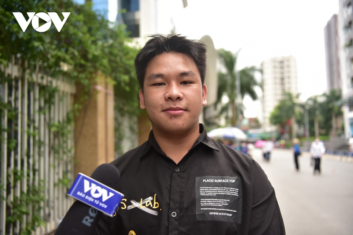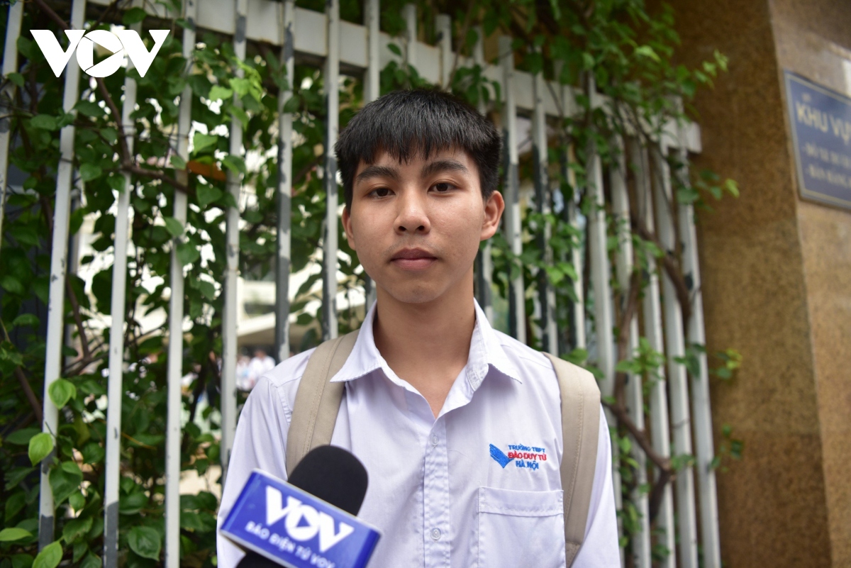 Em Phạm Thế Long, Trường THPT Lương Thế Vinh rời khỏi phòng thi với tâm trạng khá thoải mái, vui vẻ. Thế Long đăng ký làm bài tổ hợp Khoa học tự nhiên với các phần: Vật lý, Hóa học và Sinh học. Em đánh giá đề thi năm nay vừa sức, có độ khó tương đương năm ngoái.