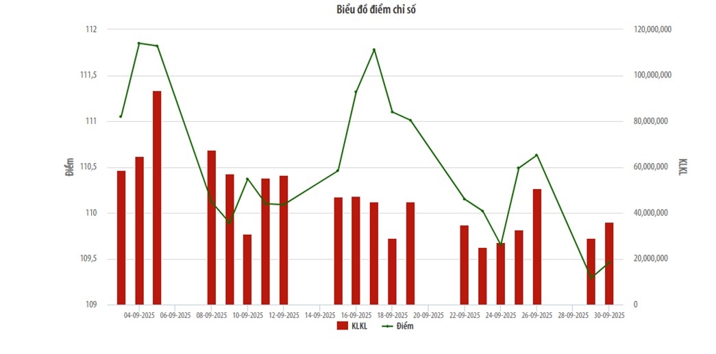 VOV.VN - Thị trường UPCoM trong tháng 9/2025 ghi nhận xu hướng giảm của chỉ số và thanh khoản. Chỉ số UPCoM-Index kết thúc tháng tại phiên ngày 30/9 đạt 110,01 điểm, giảm 0,99 điểm so với mức 111 điểm cuối tháng 8/2025.