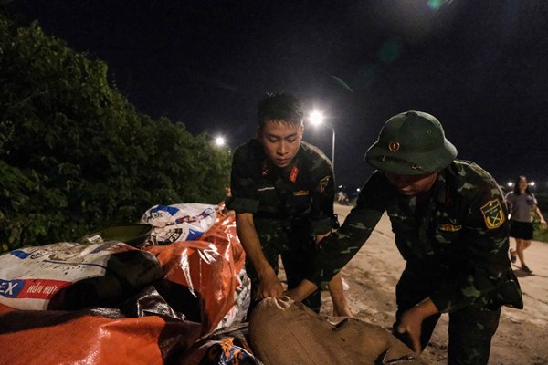 VOVVN - VOV.VN - Gần 2.000 người gồm lực lượng quân đội, công an, bảo vệ an ninh trật tự cơ sở cùng người dân xuyên đêm đắp cát ngăn đập tràn tại đê Đẩu Hàn, phường...