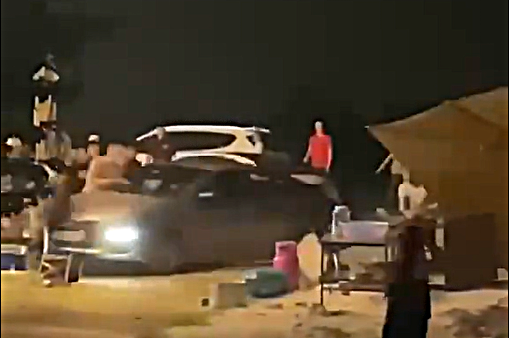 VOVVN - VOV.VN - Xe ô tô con màu xám liên tục tăng ga lùi rồi tiến, xung quanh có nhiều người lớn cầm gậy, vật dụng tấn công xe tạo nên cảnh hỗn loạn trong đêm.