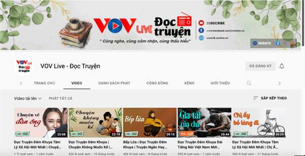 VOV1 - Kênh VOV Live – Đọc truyện đã vượt mốc 100 nghìn lượt theo dõi, đủ điều kiện để nhận danh hiệu nút bạc từ YouTube. Hiện tại, kênh này đang có hơn 24 triệu...