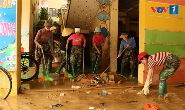 VOV1 - Tại tỉnh Quảng Bình, hôm nay (31/10), trời tạnh mưa, nước lũ rút nhiều. Tranh thủ nước xuống đến đâu, người dân và các lực lượng dọn dẹp đến đó. Nhiều giáo viên nhà còn...