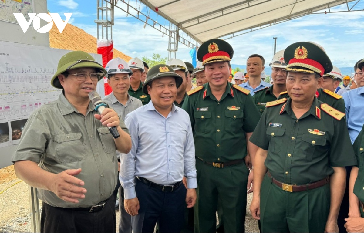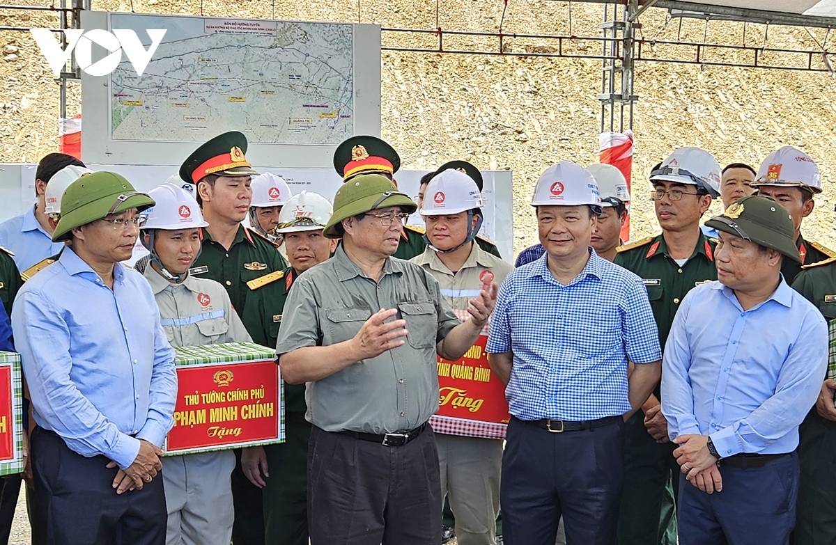 Kiểm tra Dự án Đường bộ cao tốc Bắc - Nam phía Đông đoạn qua tỉnh Quảng Bình tại Nút giao xã Quảng Lưu, huyện Quảng Trạch do Tổng Công ty Xây Dựng Trường Sơn (Binh đoàn 12, Bộ Quốc Phòng), Công ty Cp Đầu tư Xây dựng giao thông Phương Thành và Tổng Công ty 36 thi công, Thủ tướng Phạm Minh Chính Thủ tướng yêu cầu đẩy nhanh tiến độ, đảm bảo chất lượng, các yêu cầu về kỹ mỹ thuật, an toàn lao động, vệ sinh môi trường, đặc biệt không được bán thầu, tiêu cực.