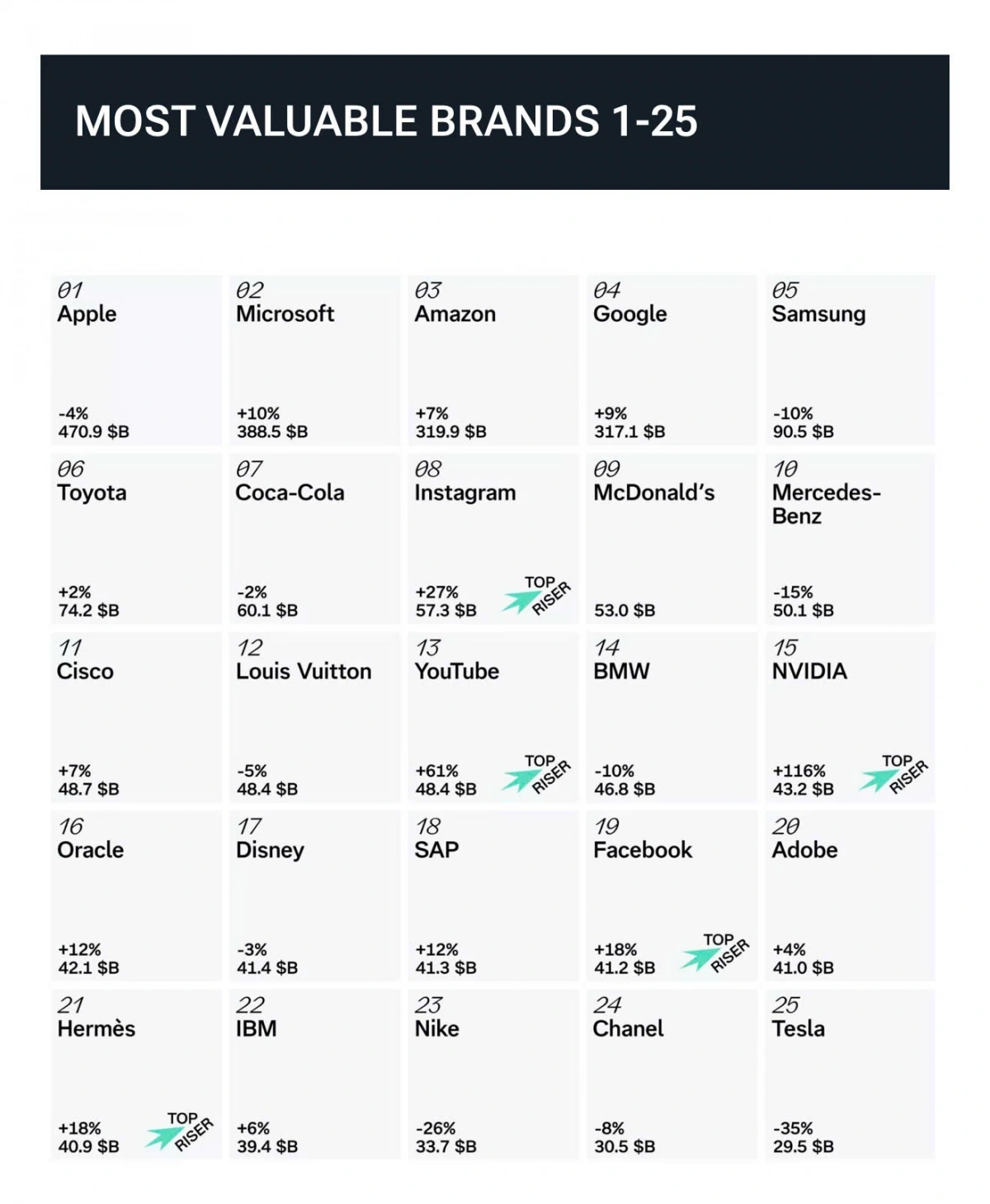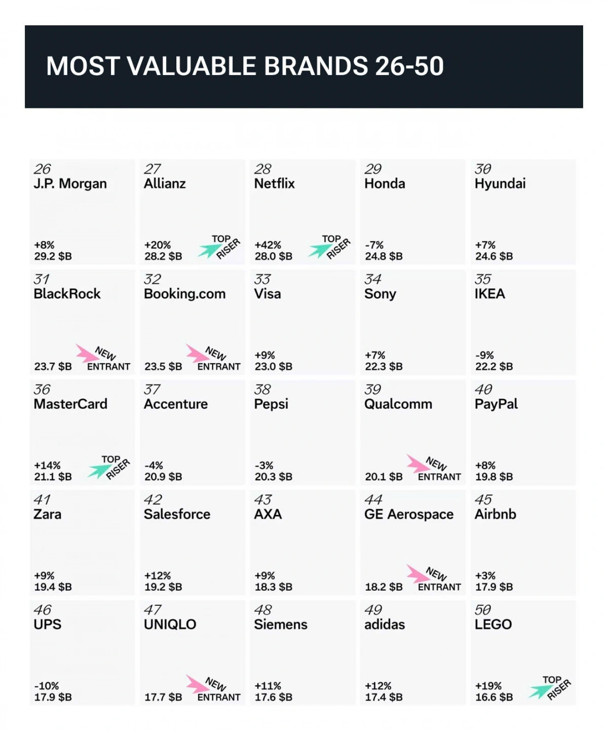 Tiếp tục xuống hạng trong danh sách là Honda (#29), Hyundai (#30), Sony (#34), Audi (#52) và Ferrari (#54). Tiếp theo là Volkswagen (#56), Porsche (#57), Uber (#64), Xiaomi (#81) và Nissan (#82). Những cái tên nổi bật còn lại là Kia (#89), Huawei (#96) và Range Rover (#97).