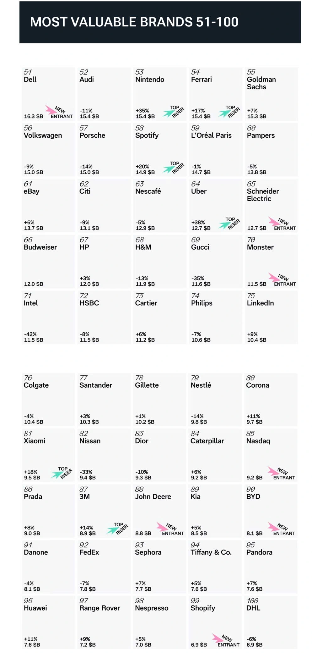 Thương hiệu mới duy nhất là BYD, đứng thứ 90 với định giá 8,1 tỷ USD. Giám đốc Chiến lược Toàn cầu của Interbrand - Manfredi Ricca cho biết: “BYD là kẻ phá vỡ kỷ lục lớn nhất trên thị trường ô tô kể từ Tesla. Sản phẩm của họ có mặt ở nhiều quốc gia và đã có những bước tiến đáng chú ý tại thị trường châu Âu khi mở rộng từ thị trường châu Á".