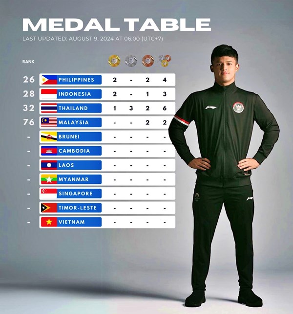 VOVVN - VOV.VN - Cập nhật bảng tổng sắp huy chương Olympic 2024 của khu vực Đông Nam Á tính đến sáng 9/8, Philippines dẫn đầu, Việt Nam không giành được huy chương nào.
