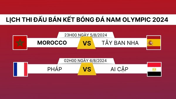 VOVVN - VOV.VN - Lịch thi đấu và trực tiếp bóng đá Olympic 2024 hôm nay 5/8, 2 trận bán kết của nội dung bóng đá nam sẽ diễn ra trên các sân cỏ của Pháp.