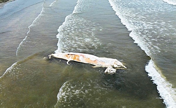 VOVVN - VOV.VN - Sáng 20/3, tại bờ biển xã Hải Châu, tỉnh Nghệ An, người dân phát hiện một xác cá voi lớn dạt vào bờ trong tình trạng phân hủy nặng.