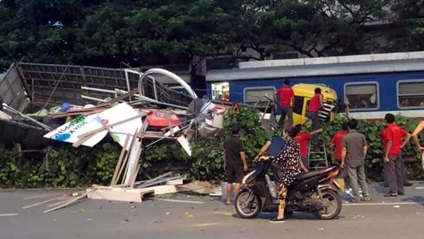 VOVVN - VOV.VN - Rạng sáng 4/9, một ô tô tải sang đường đã va chạm với tàu hỏa khiến tài xế bị thương, xe bị hư hỏng nghiêm trọng