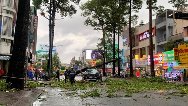 VOVVN - VOV.VN - Chiều nay (14/7), một cơn mưa lớn kèm dông sét tại TP.HCM đã khiến nhiều cây xanh bật gốc, ngã ra đường, có trường hợp cây ngã đè trúng ô tô.