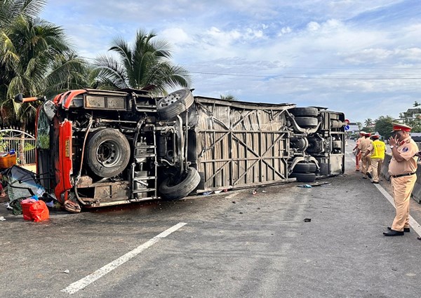 VOVVN - VOV.VN - Xe khách giường nằm bị lật nghiêng giữa đường trên Quốc lộ 1, đoạn qua xã Hàm Đức, huyện Hàm Thuận Bắc.