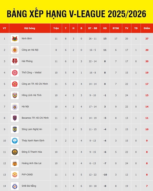 VOVVN - VOV.VN - Bảng xếp hạng V-League mới nhất: Ninh Bình củng cố ngôi đầu khi tạo ra khoảng cách 7 điểm với đội xếp sau trong khi HAGL tạm "thoát hiểm" khi đã không còn...