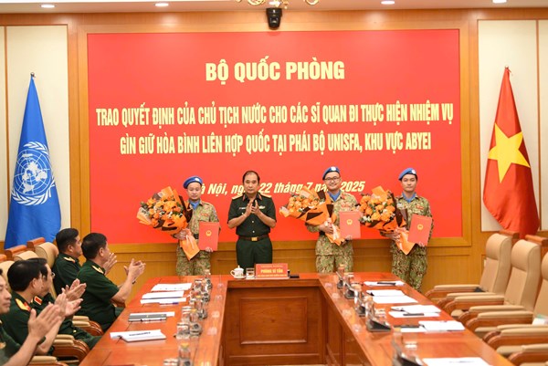 VOVVN - VOV.VN - Chiều 22/7, tại Hà Nội, Bộ Quốc phòng tổ chức Lễ trao quyết định của Chủ tịch nước cho 3 sỹ quan Quân đội Nhân dân Việt Nam đi thực hiện nhiệm vụ...