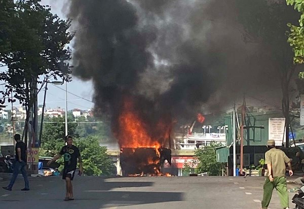 VOVVN - VOV.VN - Một ô tô khách bốc cháy dữ dội sau khi di chuyển từ bến tàu du lịch sông Hồng ra phố Chương Dương Độ (Hà Nội)