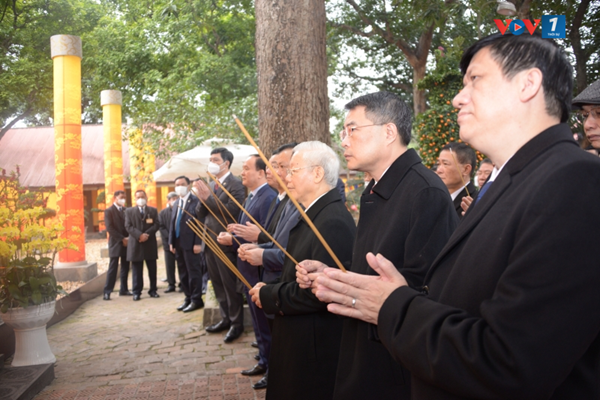 VOV1 - Sáng nay, 4/2, (mùng 4 tháng Giêng năm Nhâm Dần), trong không khí vui tươi của những ngày đầu năm mới, Tổng Bí thư Nguyễn Phú Trọng tới dâng hương tưởng nhớ các bậc tiên...
