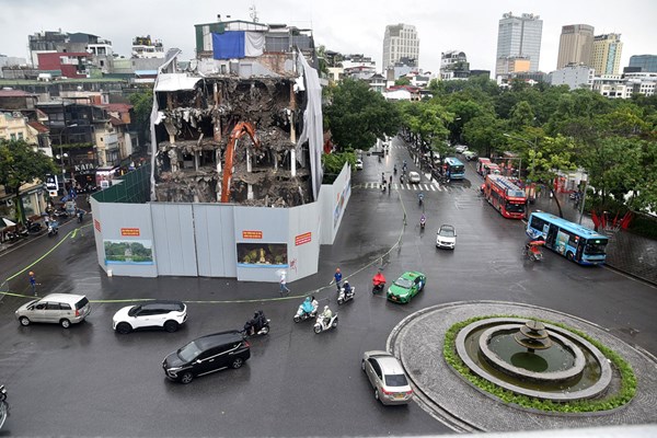 VOVVN - VOV.VN - Tòa nhà Hàm Cá Mập đang được khẩn trương phá dỡ để giải phóng mặt bằng mở rộng không gian Hồ Gươm theo đúng kế hoạch mà Hà Nội đưa ra